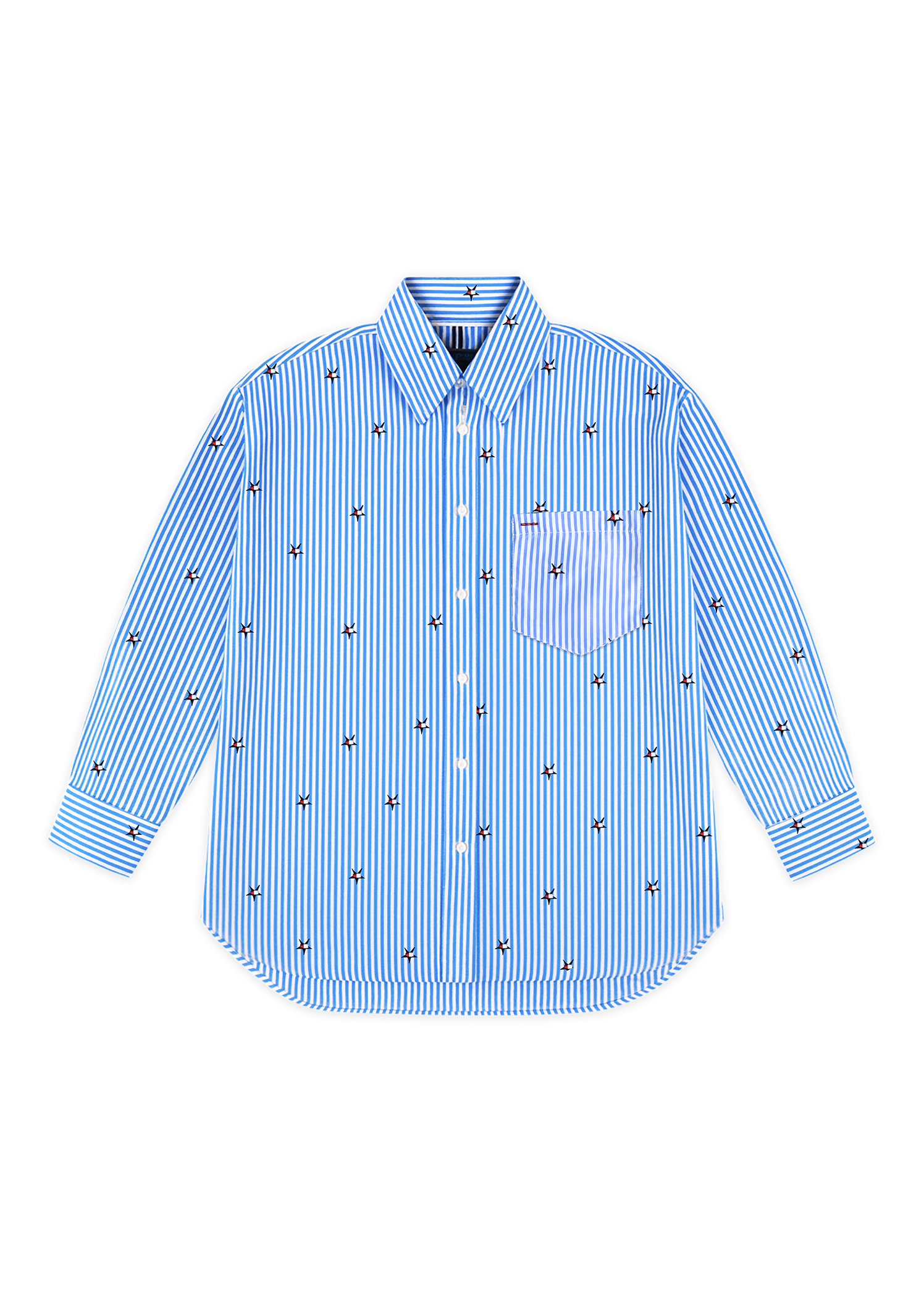 Chemise à rayures bleues et blanches rehaussée de micro-motifs étoilés brodés.